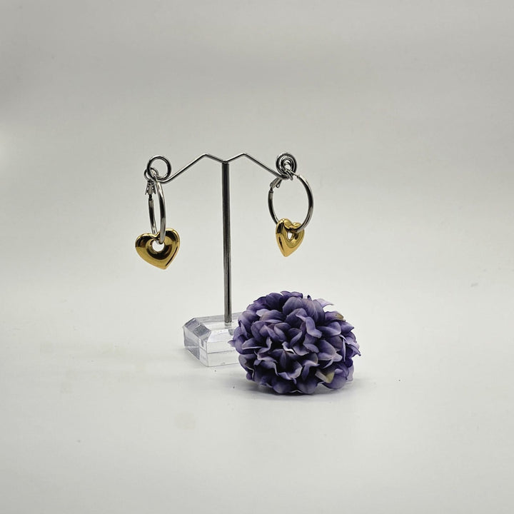 These stainless steel huggie hoop earrings offer a blend of style and durability, featuring a charming heart or star pendant in a versatile two-tone finish. Their compact design gently hugs the earlobe, making them perfect for everyday wear or layering with other pieces. Add a subtle touch of elegance and character to your look with earrings that effortlessly elevate any outfit.