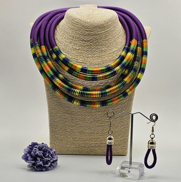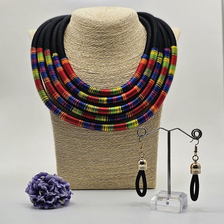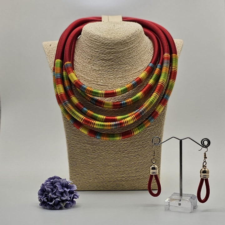 The Multilayered Woven Fashion Set is available in red, black, and purple, each featuring a vibrant mix of multi-colored woven layers. This five-layer necklace with a magnetic closure combines effortless wear with bold style, complemented by trendy earrings that complete your standout look. Perfect for adding colorful elegance to any outfit.