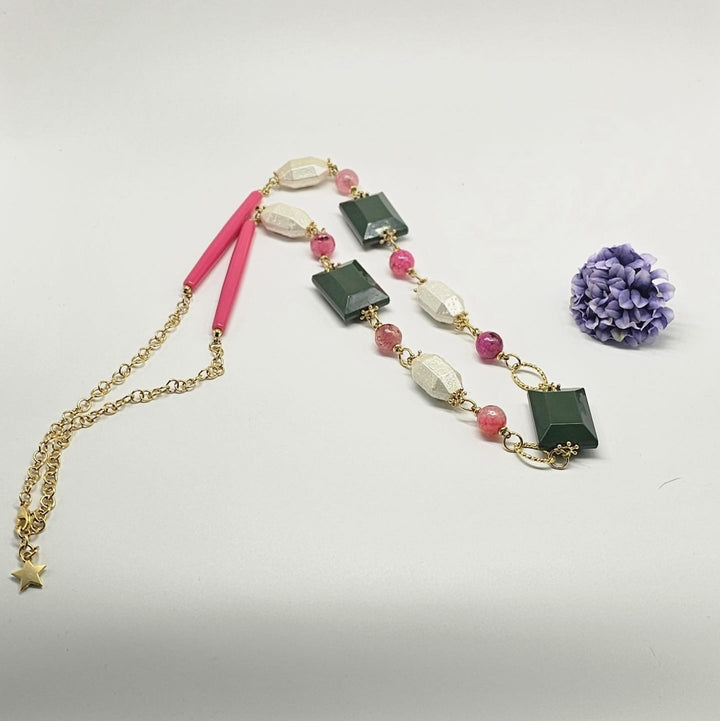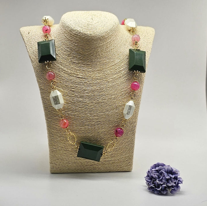 Discover the elegance of the Turkish GPW Necklace, beautifully handcrafted with semiprecious stones in pink, white, and green. Its gold-plated chain adds a luxurious touch, perfect for elevating any outfit. This unique piece blends vibrant colors and expert craftsmanship, making it an exquisite accessory that stands out with timeless charm.