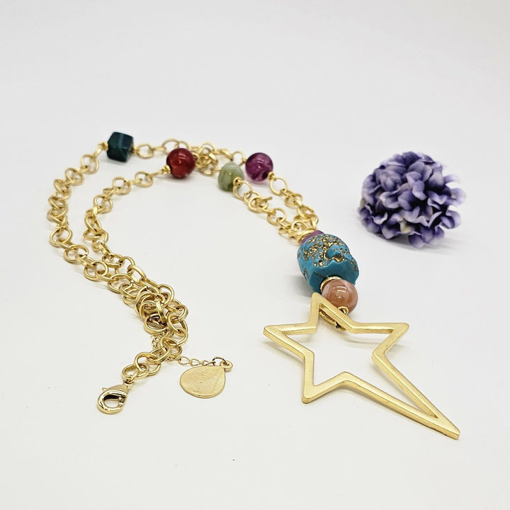 Elevate your style with the Turkish Star Necklace, featuring a stunning array of multicolored semiprecious stones. This unique piece combines intricate craftsmanship with vibrant hues, making it the perfect accessory to brighten any outfit and draw admiring glances. Wear a symbol of elegance and color that effortlessly complements both casual and formal looks.